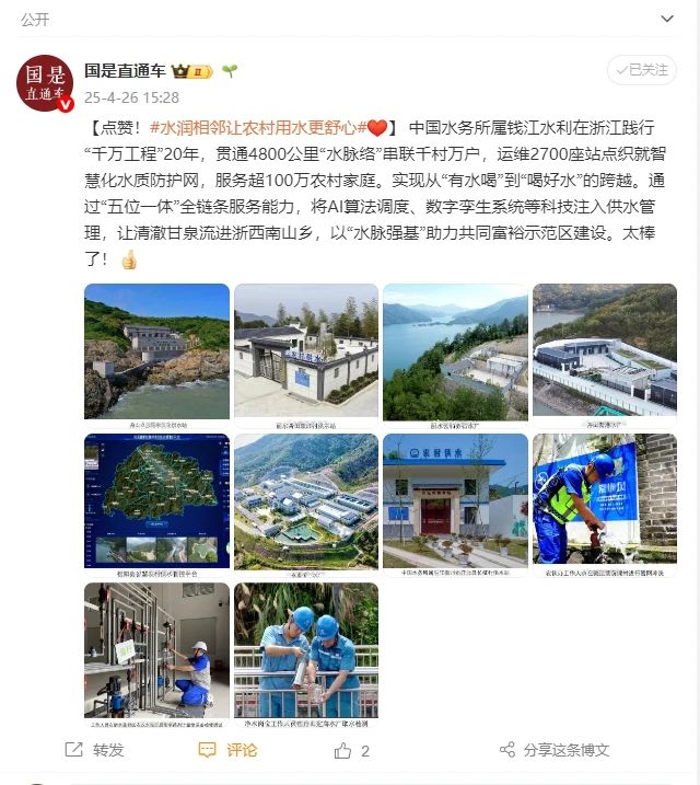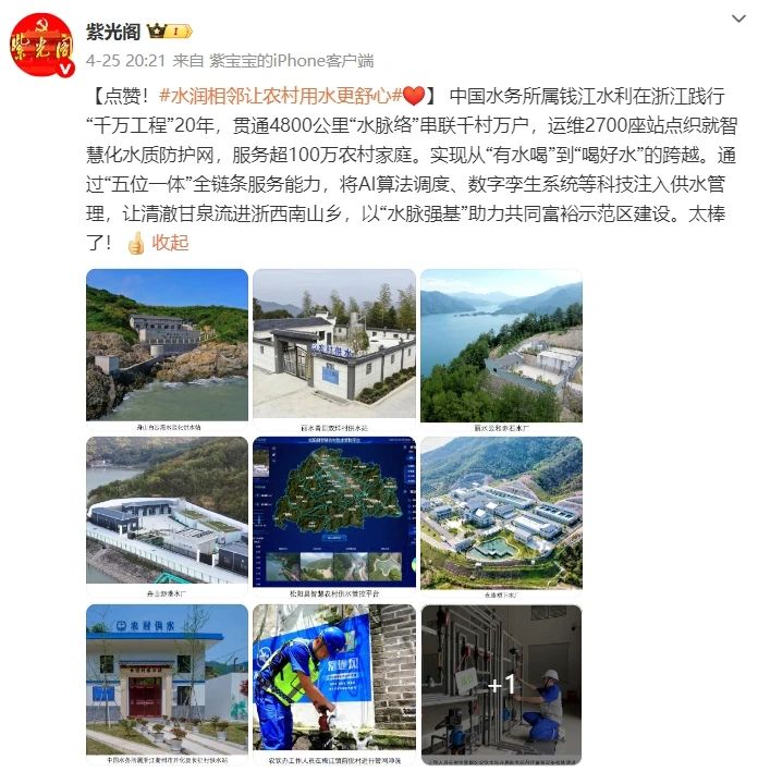 近日,紫光閣、國是直通車、中國電建微博相繼點(diǎn)贊中國水務(wù)所屬錢江水利在浙江踐行“千萬工程”20年,貫通4800公里“水脈絡(luò)”串聯(lián)千村萬戶,運(yùn)維2700座站點(diǎn)織就智慧化水質(zhì)防護(hù)網(wǎng),服務(wù)超100萬農(nóng)村家庭。