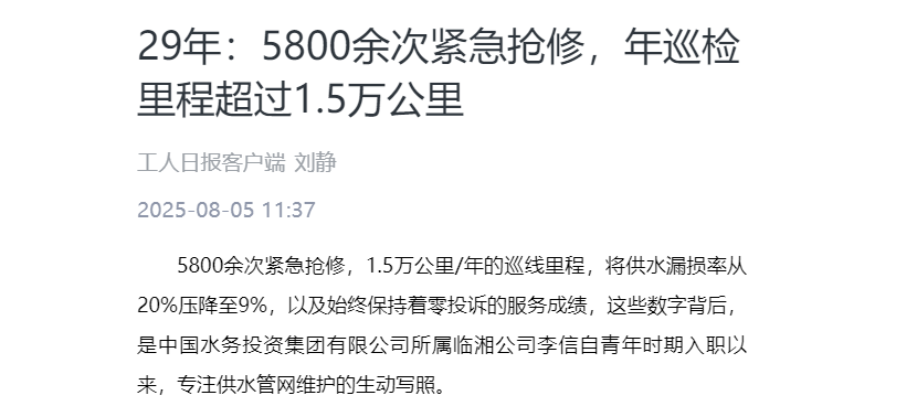 8月5日,《工人日報》報道中國水務(wù)所屬華中區(qū)域總部臨湘公司李信29年專注供水管網(wǎng)維護的事跡。29年,李信堅守在供水管網(wǎng)維護一線,累計完成5800余次緊急搶修,年巡檢里程超1.5萬公里,將管網(wǎng)漏損率從20%壓降至9%,并保持零投訴記錄,將平凡崗位淬煉成城市供水安全的堅實屏障。