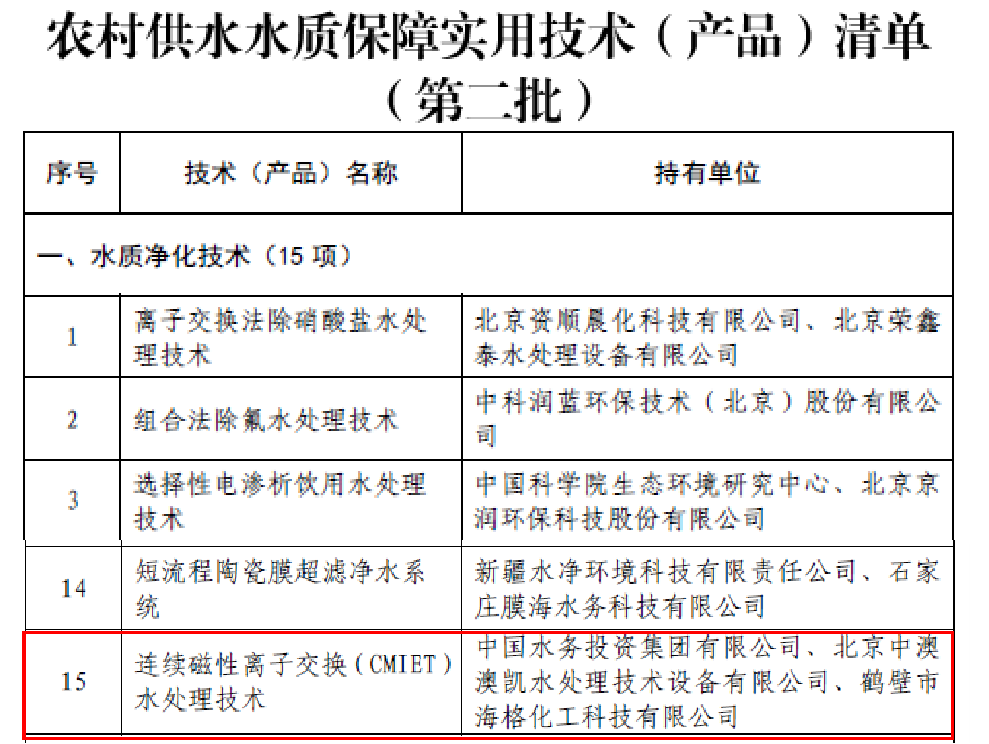 近日,水利部正式發(fā)布2025年《農(nóng)村供水水質(zhì)保障實用技術(shù)(產(chǎn)品)清單(第二批)》及《水利先進(jìn)實用技術(shù)重點推廣指導(dǎo)目錄》,中國水務(wù)研發(fā)的"連續(xù)磁性離子交換(CMIET)水處理技術(shù)"和"單村水站精準(zhǔn)消毒處理與控制關(guān)鍵技術(shù)"雙雙入選。