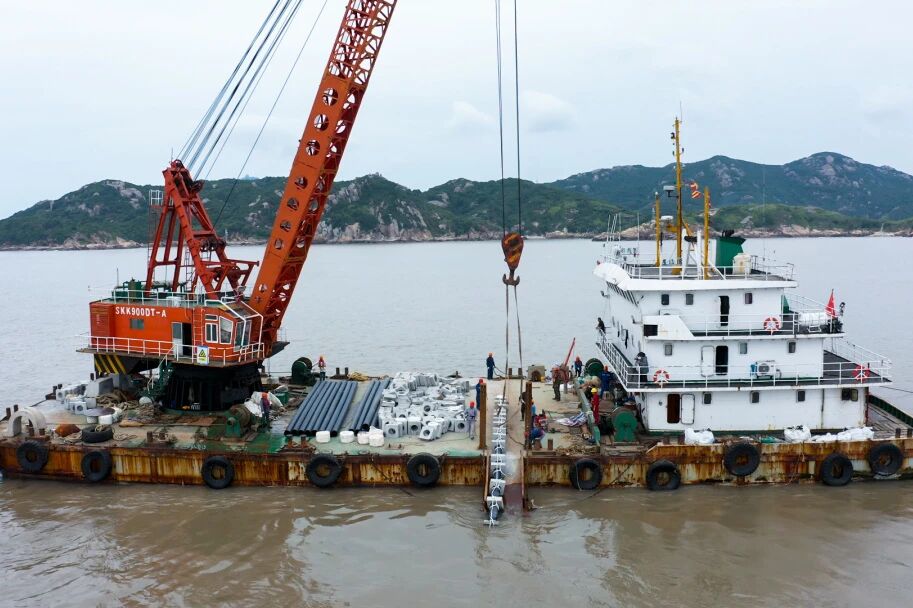 朱家尖至白沙島、柴山島聯(lián)網(wǎng)供水(海上段)工程開(kāi)工建設(shè),施工團(tuán)隊(duì)克服臺(tái)風(fēng)頻發(fā)、潮汐影響等多重挑戰(zhàn),在30余米深的海底精準(zhǔn)鋪設(shè)輸水管道。