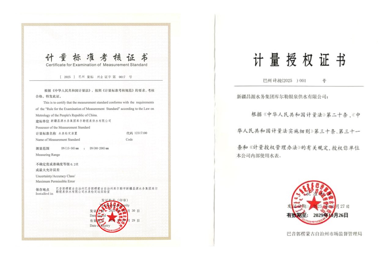 近日,昌源集團(tuán)庫爾勒銀泉供水公司傳來喜訊,成功獲得新疆巴音郭楞蒙古自治州市場監(jiān)督管理局頒發(fā)的《計(jì)量標(biāo)準(zhǔn)考核證書》及《計(jì)量授權(quán)證書(內(nèi)部)》。這項(xiàng)資質(zhì)的取得,標(biāo)志著銀泉供水公司在水表計(jì)量檢定領(lǐng)域?qū)崿F(xiàn)新的突破,為公司高質(zhì)量發(fā)展注入強(qiáng)勁動(dòng)力,也為保障區(qū)域供水計(jì)量精準(zhǔn)性奠定堅(jiān)實(shí)基礎(chǔ)。