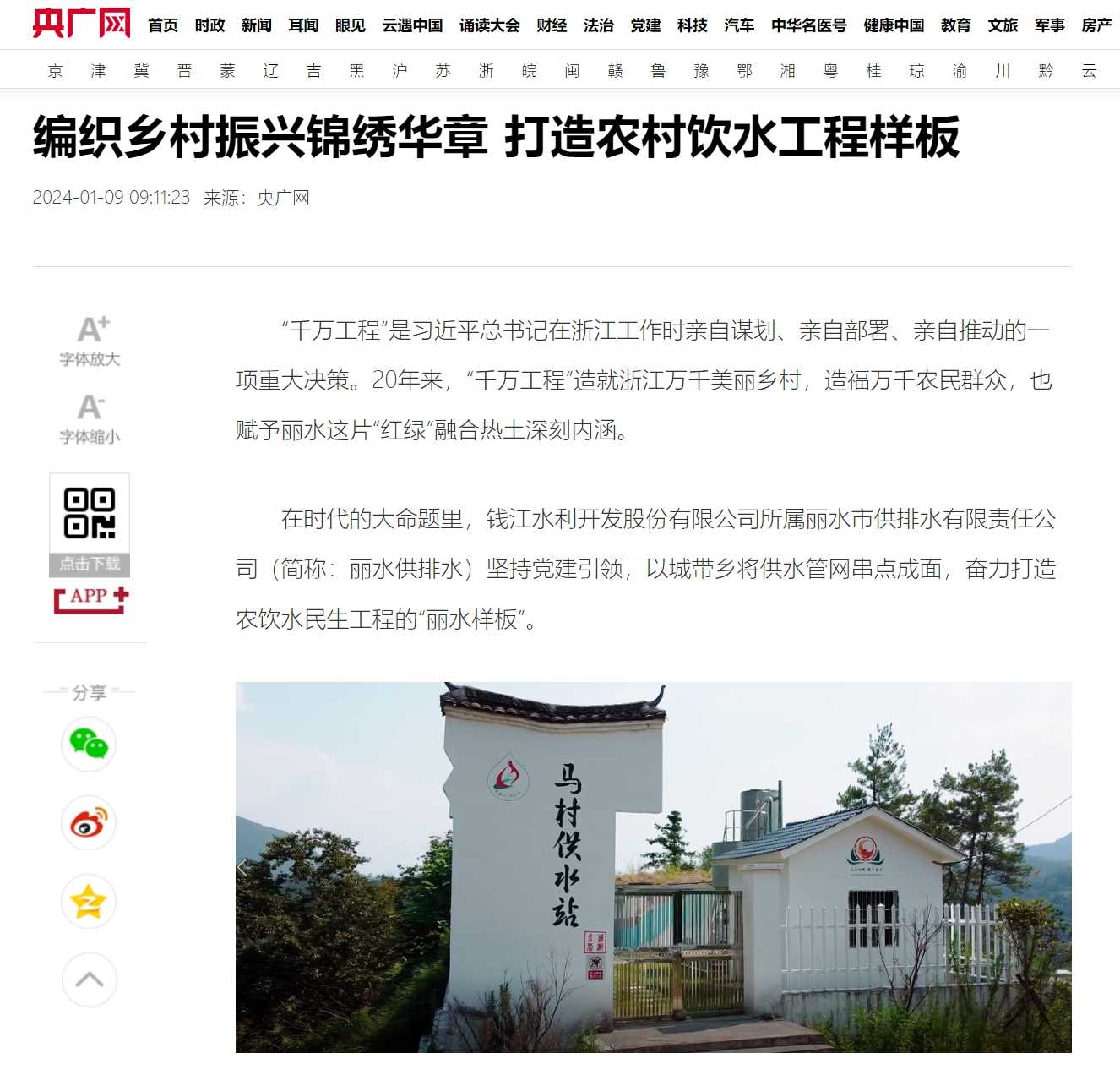 1月9日,央廣網(wǎng)報道中國水務(wù)所屬麗水供排水堅持黨建引領(lǐng),以城帶鄉(xiāng)將供水管網(wǎng)串點(diǎn)成面,用心用情把農(nóng)飲水民生工程抓實(shí)落細(xì),把政治熱情轉(zhuǎn)化為助力鄉(xiāng)村振興的美好愿景,高質(zhì)量推動人水和諧的生動實(shí)踐。