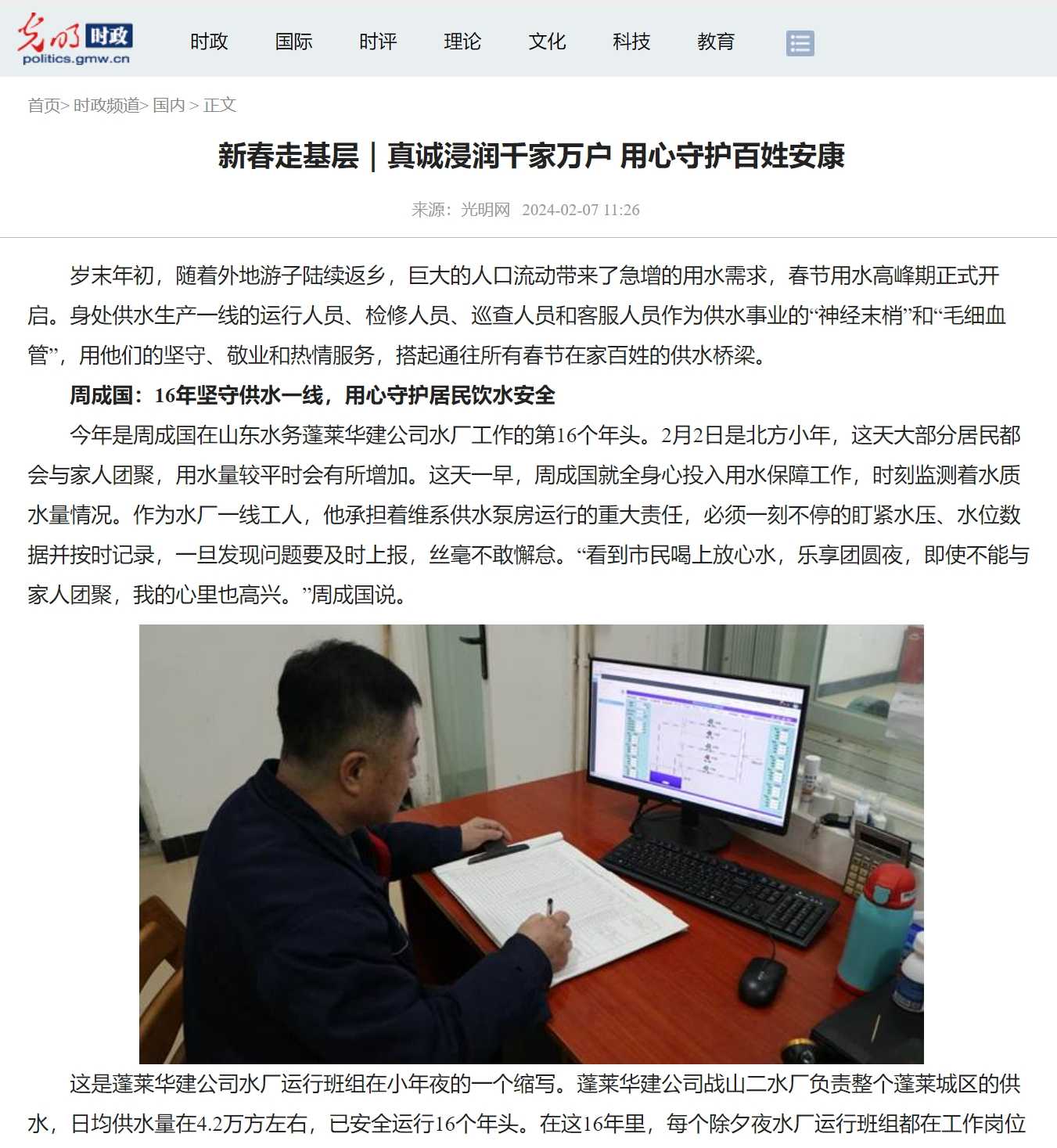 近日,光明網(wǎng)報道中國水務(wù)供水生產(chǎn)一線的運(yùn)行人員、檢修人員和客服人員用他們的堅守、敬業(yè)和熱情服務(wù),確保人民群眾度過一個快樂、祥和的春節(jié)。