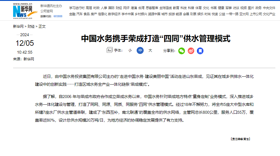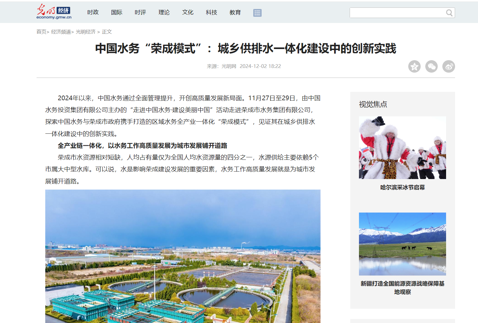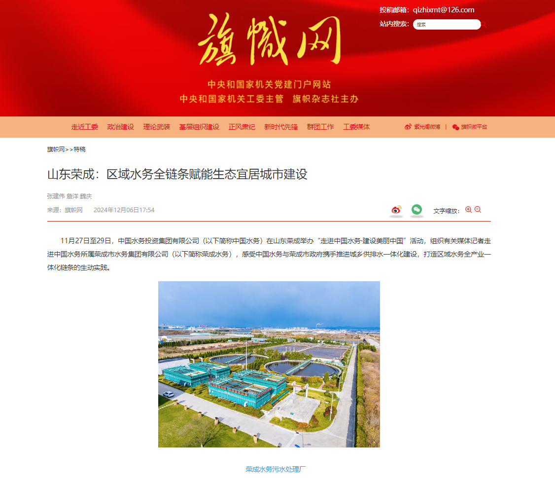 近日,旗幟網、新華網、中國環(huán)境報、中國水利報等多家中央、行業(yè)媒體相繼報道了中國水務助推城鄉(xiāng)供水一體化建設和農村治污模式的經驗做法,全方位展示公司推動實現(xiàn)城鄉(xiāng)供水“同網、同源、同質、同服務”的管理模式,探索中國水務與榮成市政府攜手打造的區(qū)域水務全產業(yè)一體化“榮成模式”。
