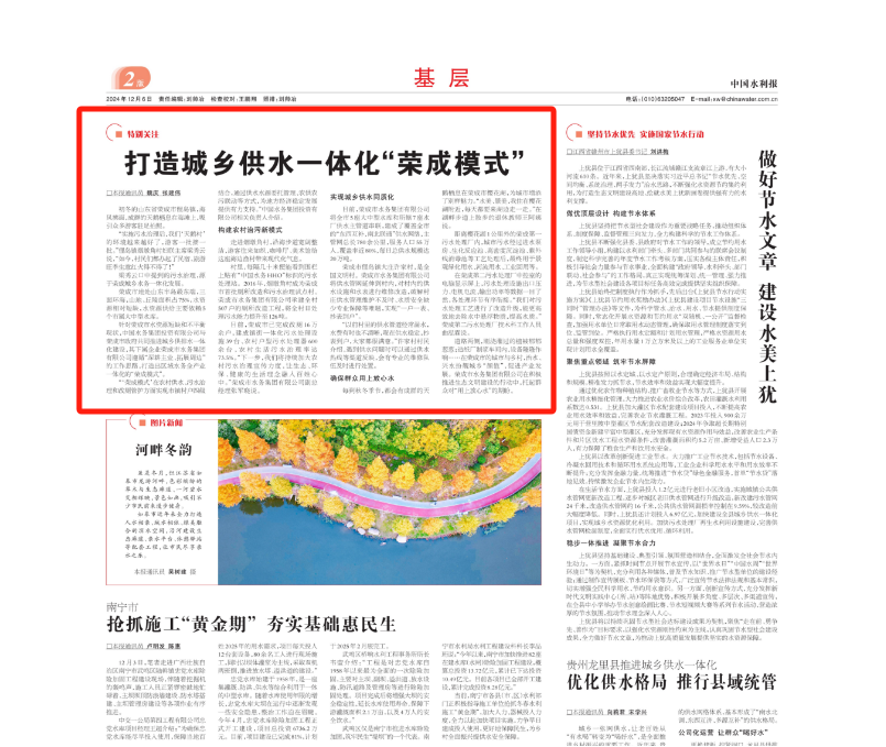 此次調研行活動多家媒體的報道,是對中國水務城鄉(xiāng)供水一體化創(chuàng)新模式的高度認可,展示了公司高質量發(fā)展的“水務名片”。中國水務將繼續(xù)踐行城鄉(xiāng)融合發(fā)展的方針政策,大力推進城鄉(xiāng)供水一體化建設與管理,助力描繪鄉(xiāng)村振興與農業(yè)農村現(xiàn)代化的宏偉藍圖。