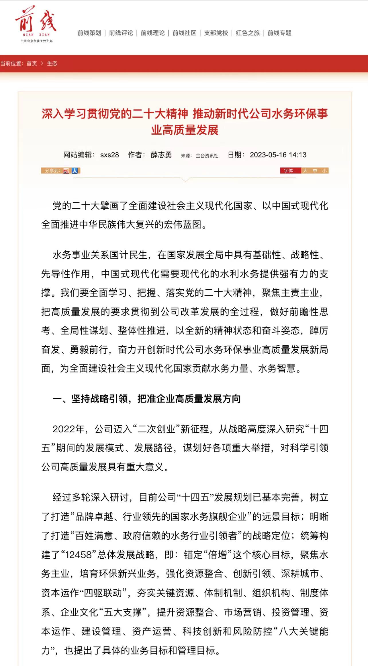 黨的二十大擘畫了全面建設(shè)社會主義現(xiàn)代化國家、以中國式現(xiàn)代化全面推進中華民族偉大復(fù)興的宏偉藍圖。水務(wù)事業(yè)關(guān)系國計民生,在國家發(fā)展全局中具有基礎(chǔ)性、戰(zhàn)略性、先導(dǎo)性作用,中國式現(xiàn)代化需要現(xiàn)代化的水利水務(wù)提供強有力的支撐。我們要全面學(xué)習(xí)、把握、落實黨的二十大精神,聚焦主責(zé)主業(yè),把高質(zhì)量發(fā)展的要求貫徹到公司改革發(fā)展的全過程,做好前瞻性思考、全局性謀劃、整體性推進,以全新的精神狀態(tài)和奮斗姿態(tài),踔厲奮發(fā)、勇毅前行,奮力開創(chuàng)新時代公司水務(wù)環(huán)保事業(yè)高質(zhì)量發(fā)展新局面,為全面建設(shè)社會主義現(xiàn)代化國家貢獻水務(wù)力量、水務(wù)智慧。