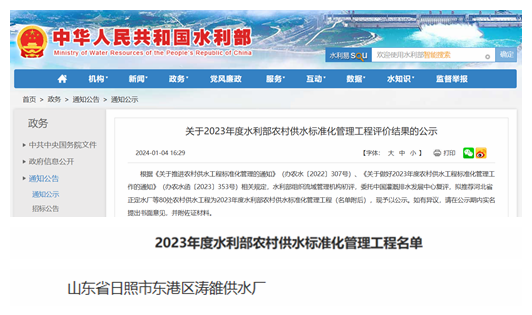 山東水務(wù)所屬日照海洋水務(wù)濤雒供水廠榮獲水利部2023年農(nóng)村供水標(biāo)準(zhǔn)化管理工程,成為日照市唯一入選單位。