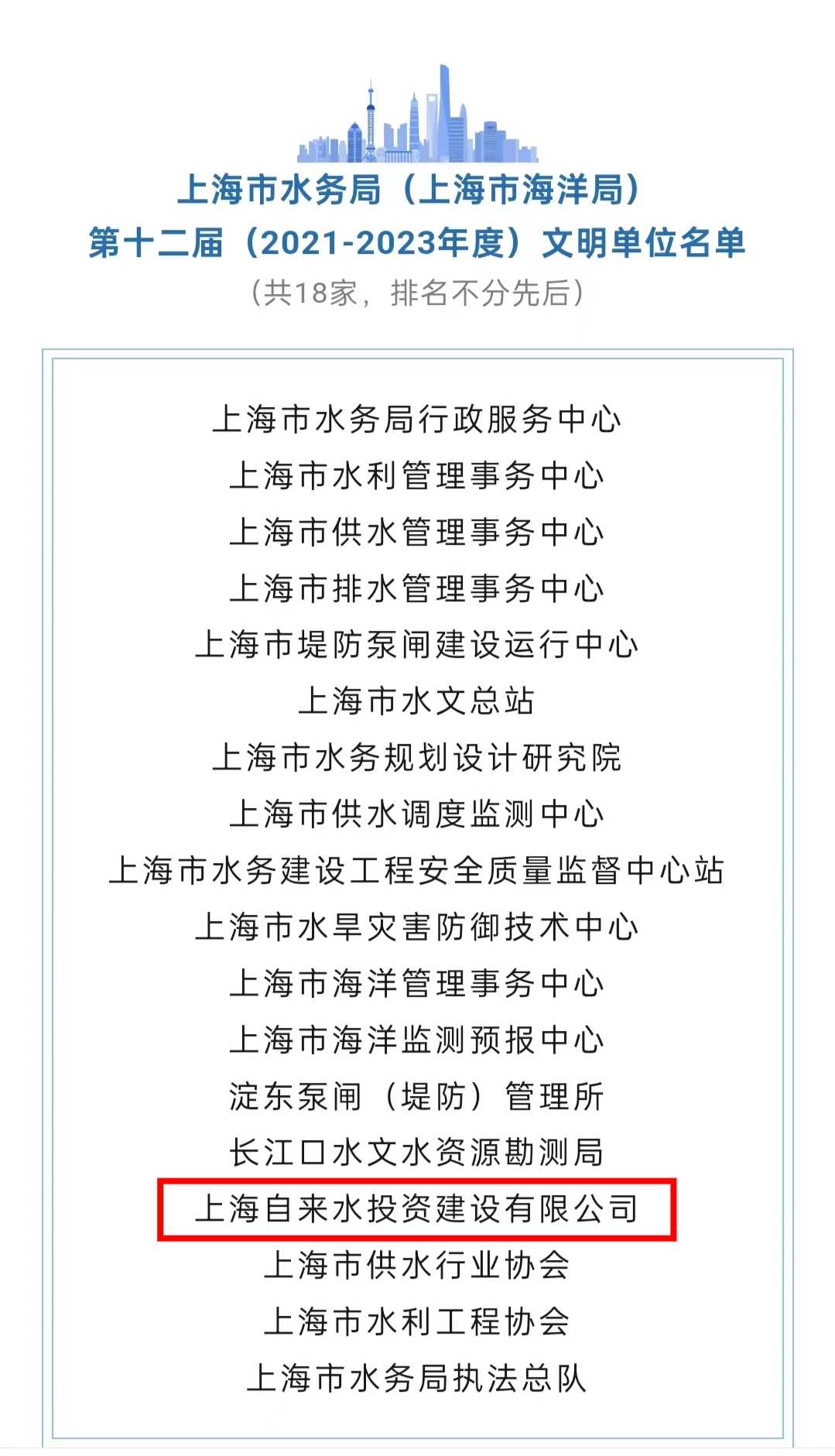 經(jīng)上海市水務(wù)局(上海市海洋局)綜合考評(píng),上海自來水投資建設(shè)有限公司被命名為:第十二屆(2021-2023年度)上海市水務(wù)局(上海市海洋局)文明單位。