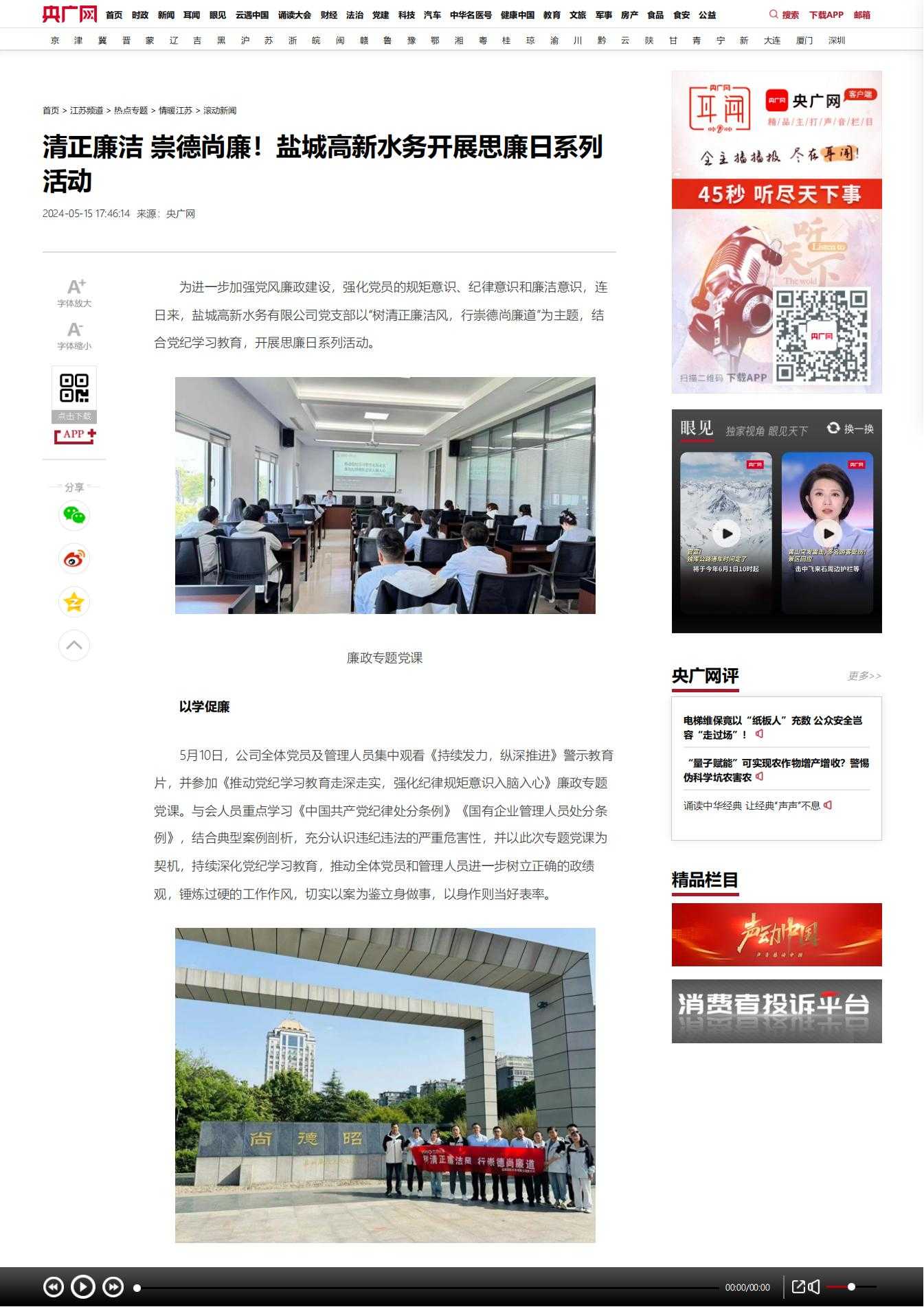 5月15日,《央廣網》報道中國水務華東區(qū)域總部鹽城高新水務黨支部黨紀學習教育開展情況。鹽城高新水務黨支部認真貫徹落實上級黨委部署安排,準確把握黨紀學習教育目標要求,通過開展集中學習、觀看警示教育片、召開專題黨課、設立廉潔文化墻、廉潔文化讀書角等形式多樣的實踐活動,把黨紀教育和黨性教育、廉潔教育相融合,著力營造公司風清氣正、干事創(chuàng)業(yè)的濃厚氛圍。