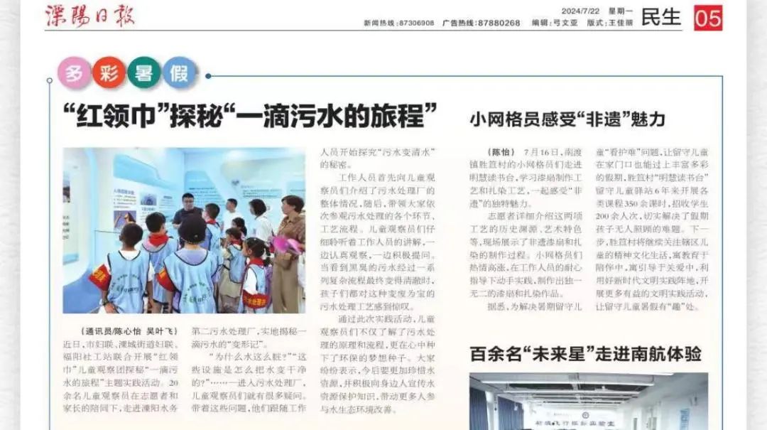 近日,《溧陽日報》報道了在華東區(qū)域總部溧陽水務(wù)第二污水處理廠節(jié)水科普基地開展的實(shí)踐活動。該節(jié)水科普基地是溧陽水務(wù)搭建的面向社會開放的、傳播節(jié)水知識、推廣節(jié)水措施、提升節(jié)水意識的公益平臺,接待前來參觀學(xué)習(xí)的社會各界人士超2500人次。